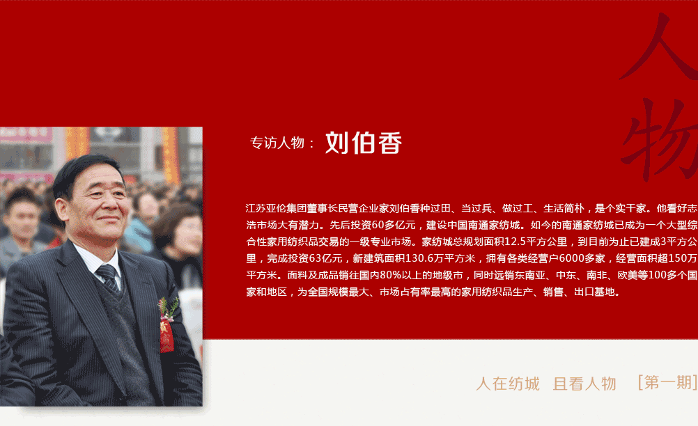 張謇先生說(shuō):"天之生人也,與草木無(wú)異。若遺留一二有用事業(yè),與草木同生,即不與草木同腐。"劉伯香做到了。他和他旗下的亞倫集團(tuán),在南通家紡發(fā)展的長(zhǎng)河中,閃爍著獨(dú)特光芒;他所做的事業(yè)、所創(chuàng)的成就,是南通家紡產(chǎn)業(yè)中的華彩篇章。